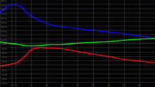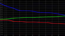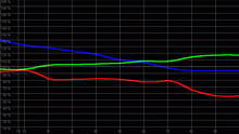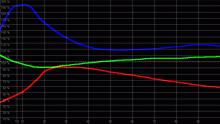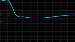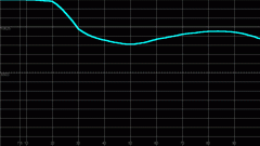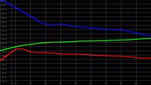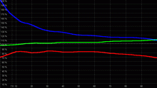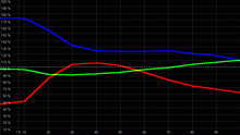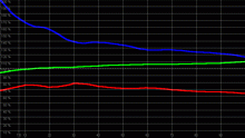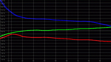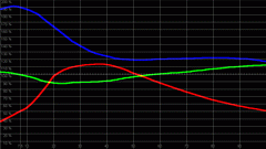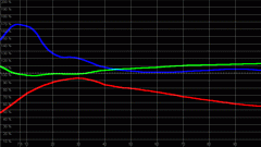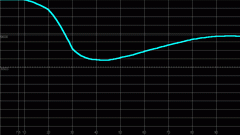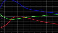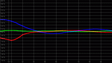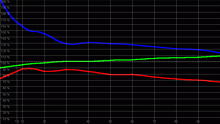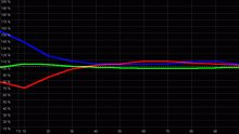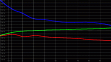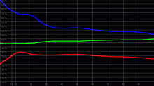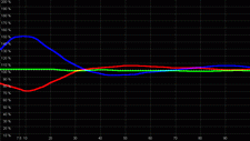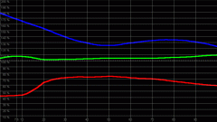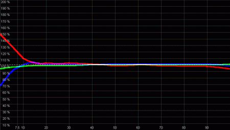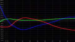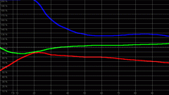 Man erkennt sofort, die geforderte Farbtemperatur von 6500K ist an praktisch keiner Stelle gewährleistet. Rot zeigt einen stetigen Abfall bis hin zu einem 50% Mangel in hellen Bildbereichen. Blau liegt 20% über dem Optimalwert (gestrichelte Linie). Auch Grün zeigt ein leichtes Kurvenverhalten. Folge dieser ungenauen Farbdarstellung: Eine viel zu kühle Bilddarstellung über fast alle Helligkeitsbereiche: