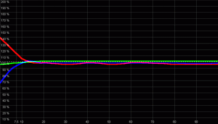 Das Projektionsbild, das zu obigen Messergebnissen führt, weist z.B. einen deutlichen Rot- und Blauüberschuss auf. Die resultierende Farbtemperatur hat zuwenig Grünanteile im Bild. Diese Farbverfälschungen können durch die gebotenen Einstellmöglichkeiten eines Projektors ausgeglichen werden. Die Genauigkeit der Kalibrierung hängt hier von den gebotenen Bildparametern ab. Je besser und flexibler die Einstelloptionen, desto genauer die zu erreichenden Ergebnisse. Wenn nötig, werden zur Farboptimierung auch farbliche Korrekturen der Optik vorgenommen, z.B. durch Filter. Der Anwender merkt oft erst nach der Kalibrierung, wo die Vorteile der korrekten Farbdarstellung liegen. Das Bild wirkt natürlicher, glaubhafter und vermittelt das wahre "Kino-Feeling". Im günstigsten Fall wird eine nahezu perfekte Kalibrierung auf die erforderlichen 6500K in allen Graustufen erzielt: