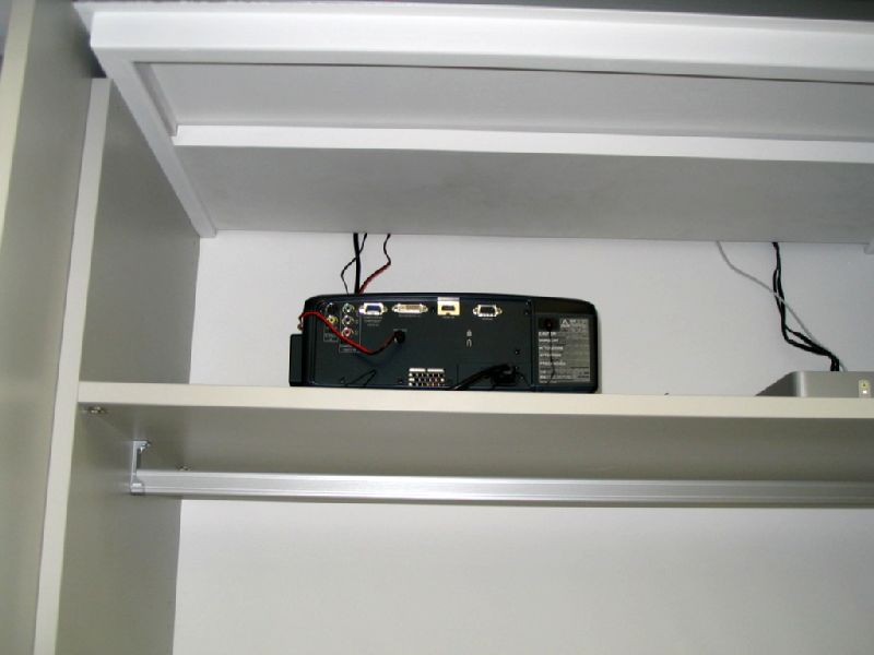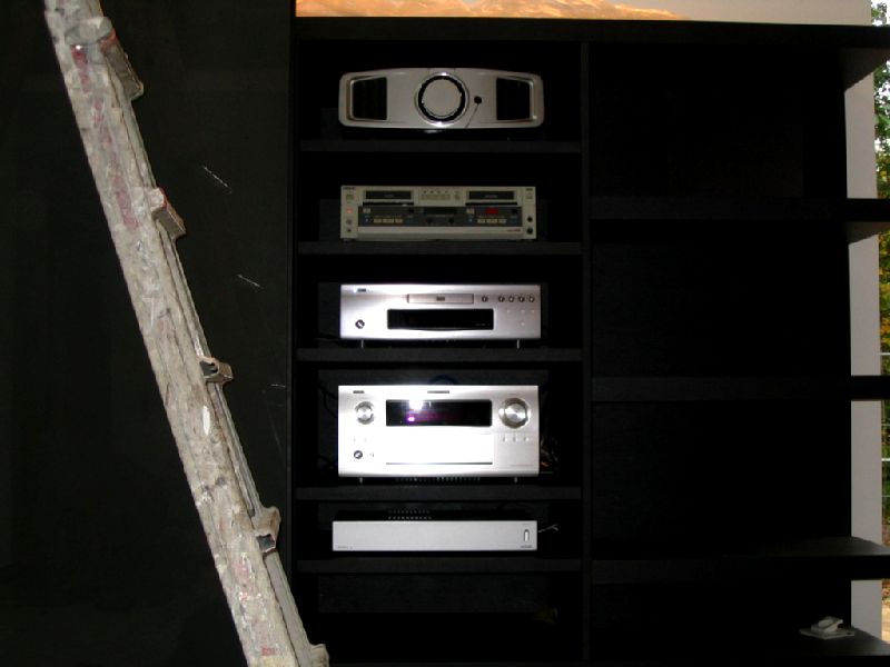 Audiolab Endstufen, SWANS F2.2 Frontlautsprecher, Center und Rear Sonderanfertigung SWANS-Chassis, Subwoofer Sonderanfertigung Thympany LAT, Nevo SL-Systemfernbedienung, Topfield HD-Sat-Tuner, WS-Leinwand, Sonos, Mediacraft Infrarotsystem